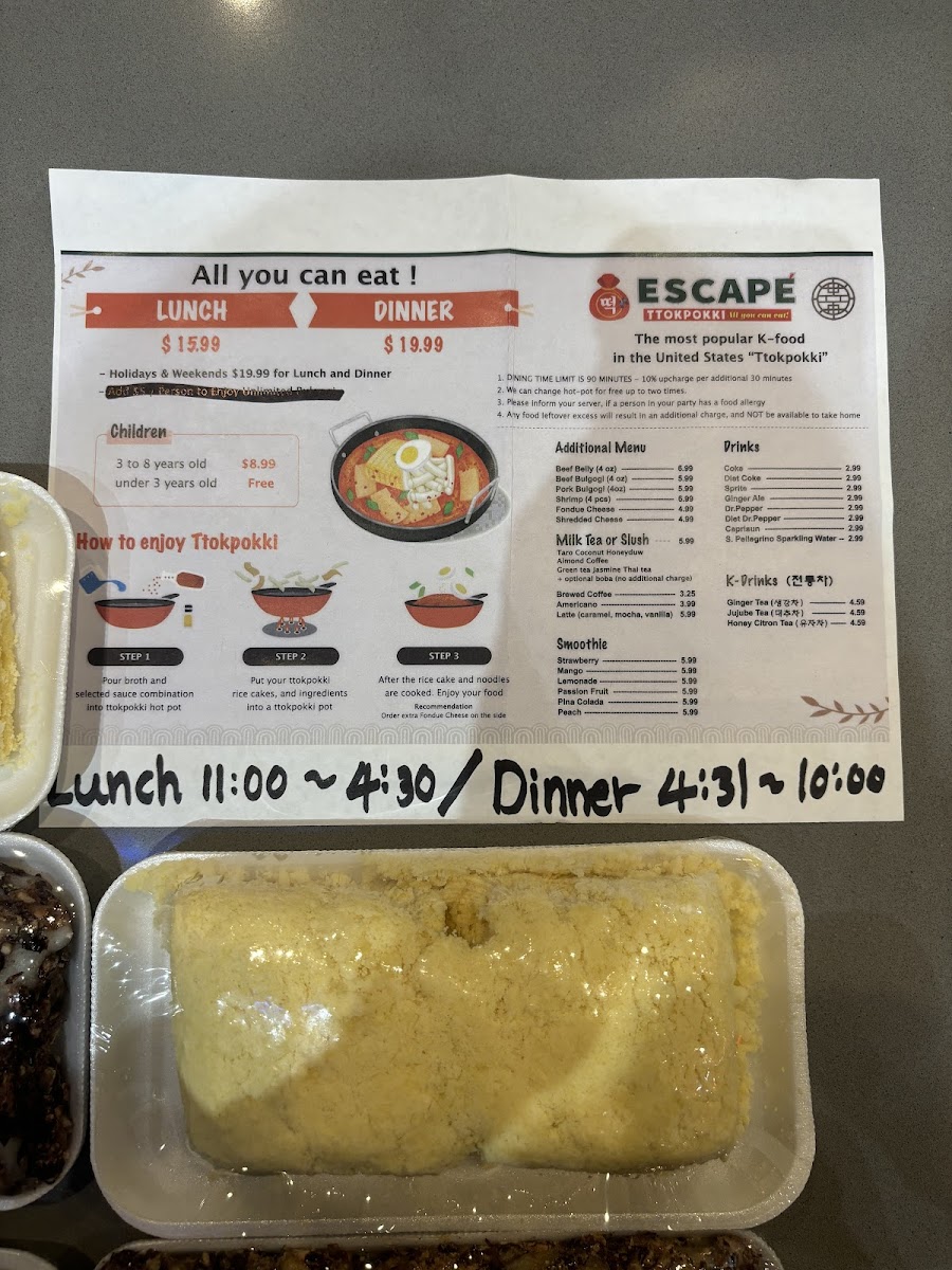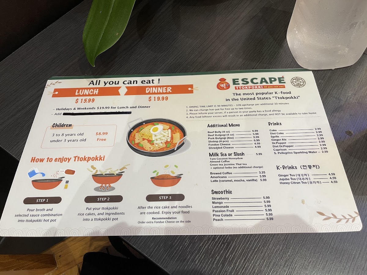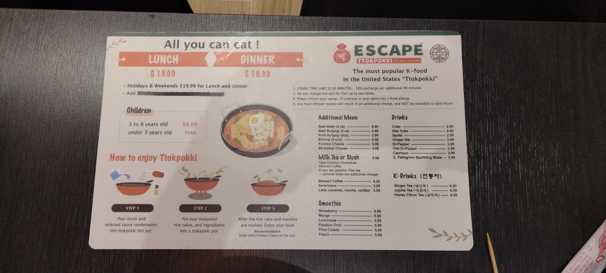 Escape Ttopokki offers a menu centered around Korean comfort foods, featuring a mix of casual bites and shareable dishes that suit a relaxed dining experience. The menu emphasizes customizable rice cake dishes like ttopokki and hot pot, alongside a selection of appetizers and light sides to complement the main flavors.